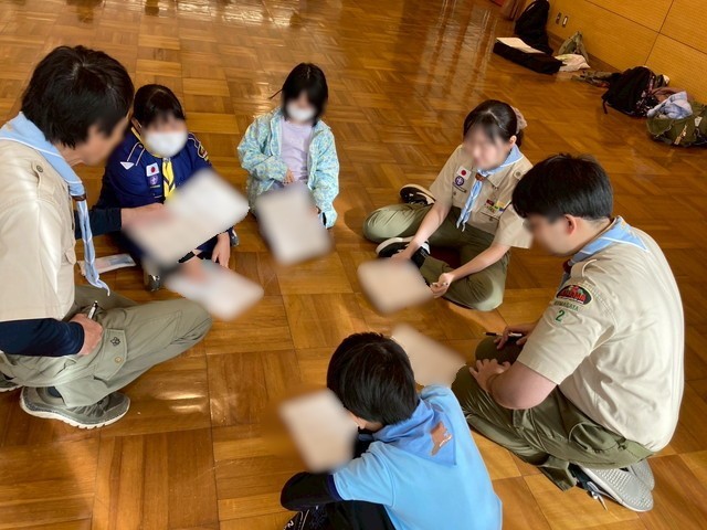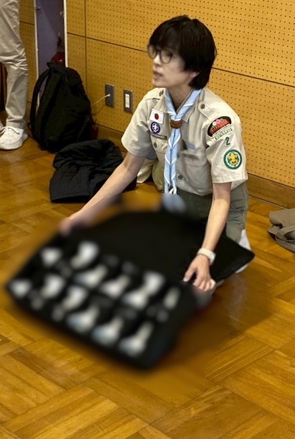 隊長が出し物の小道具を取り出して説明しています。